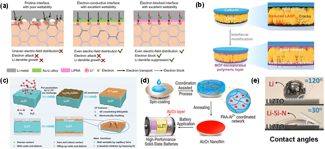 图7. 氧化物电解质和锂金属负极界面相关研究。(a)不同界面处锂枝晶生长的示意图,从左到右分别为LLZTO/Li 界面、LLZTO@Au/Li 界面和 LLZTO@EBS/Li 界面;(b)在LAGP与锂金属之间构筑MOF@PEO复合层;(c)Li/CF-LLZTO界面的构建过程示意图和层的主要功能说明;(d)形成金属氧化物纳米薄膜的配位辅助沉积工艺示意图;(e)Li-Si-N熔体和Li熔体分别与LLZTO表面的接触角。