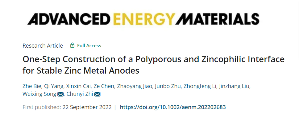 Zhe Bie, et al, One-Step Construction of a Polyporous and Zincophilic Interface for Stable Zinc Metal Anodes, Adv. Energy Mater. 2022,