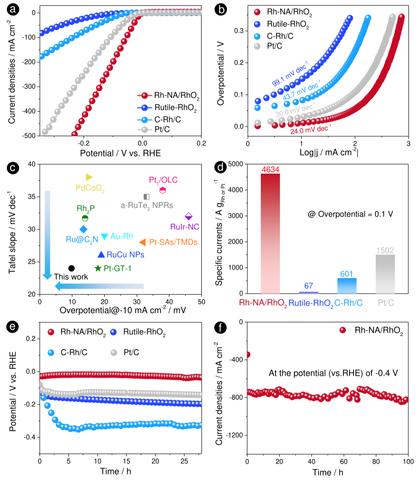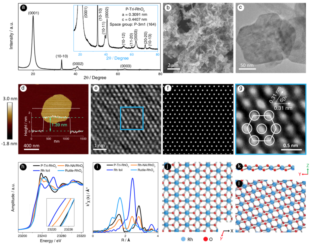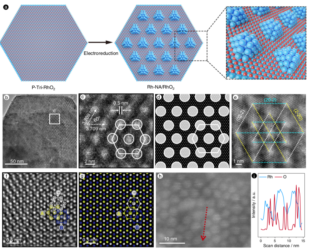 鉴于此, 苏州大学 邵琪 、邵名望、康振辉、刘阳,马普所 Zhiwei Hu 等 报告了一种二维层状亚稳态氧化物 -- 三相氧化铑(空间群, P-3m1 ),它提供了一个平台,可以在六边形图案中构建有序的面心立方铑纳米晶体阵列,表面内距离仅为 0.5 nm 。在这种催化剂中,有序的铑阵列和可变质基质的耦合引发并改善了氢的溢出,加强了酸性氢的演化,以促进氢气生成。