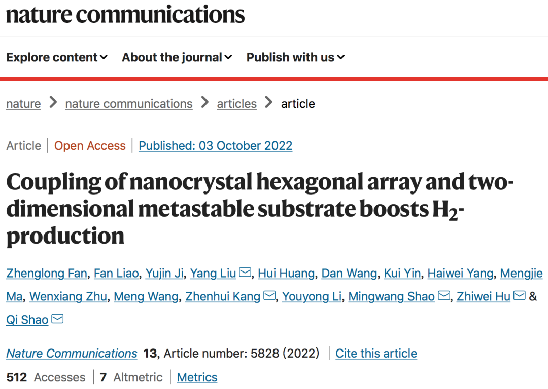 Fan, Z., Liao, F., Ji, Y. et al. Coupling of nanocrystal hexagonal array and two-dimensional metastable substrate boosts H 2 -production. Nat Commun 2022, 13, 5828.