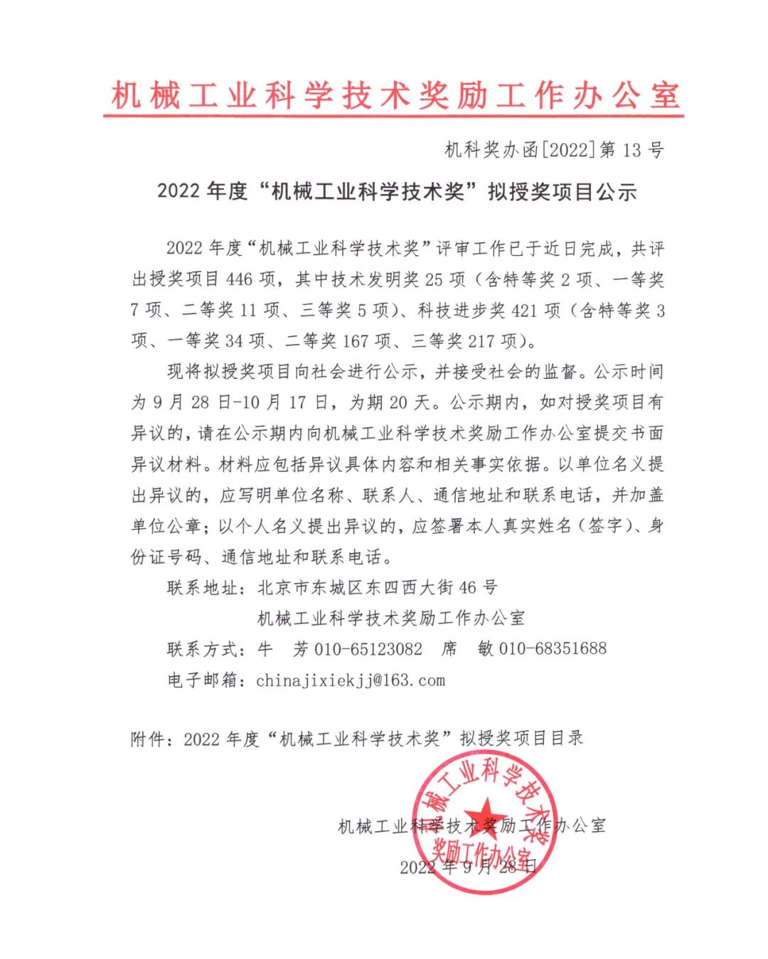 2022年度“ 机械工业科学技术奖 ”评审工作已于近日完成,共评 出授奖项目446项,其中技术发明奖25项(含特等奖2项、一等奖 7 项、二等奖11项、三等奖5项)、科技进步奖421项(含特等奖3项、一等奖 34项、二等奖167 项、三等奖217 项)。