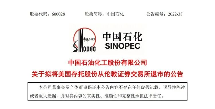10月3日 ,中国石油化工股份公司发布重要公告,称 公司已申请撤销其美国存托股以全球存托凭证形式在英国金融市场行为监管局正式清单的标准板块上市以及在伦交所主板市场交易。 每股存托股代表公司100股H股,每股H股面值1.00元人民币。