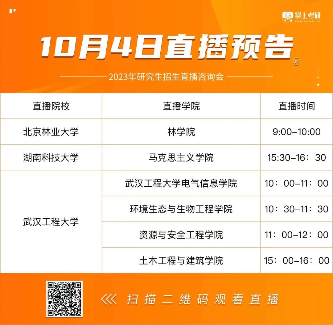 明日, 中国教育在线·掌上考研 为您奉上来自 北京林业大学、湖南科技大学等3所高校 的 6场 硕士研究生招生直播宣讲 。具体场次安排,详见下表: