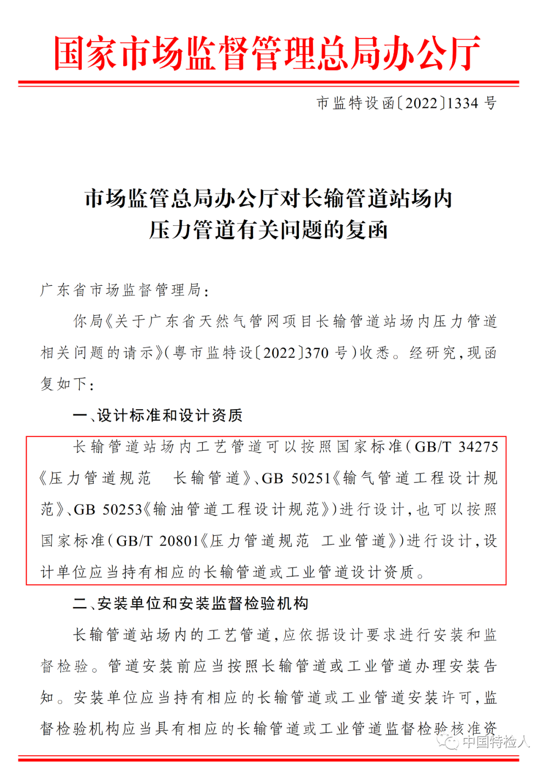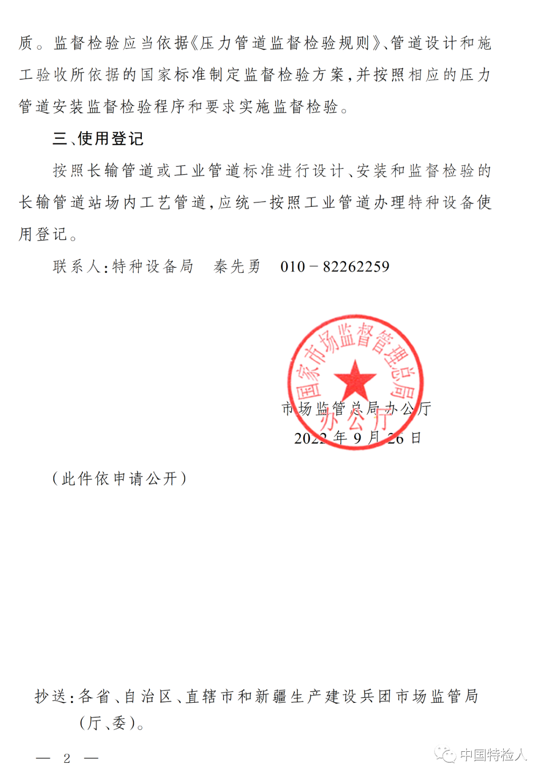 市场监管总局办公厅对长输管道站场内压力管道有关问题的复函