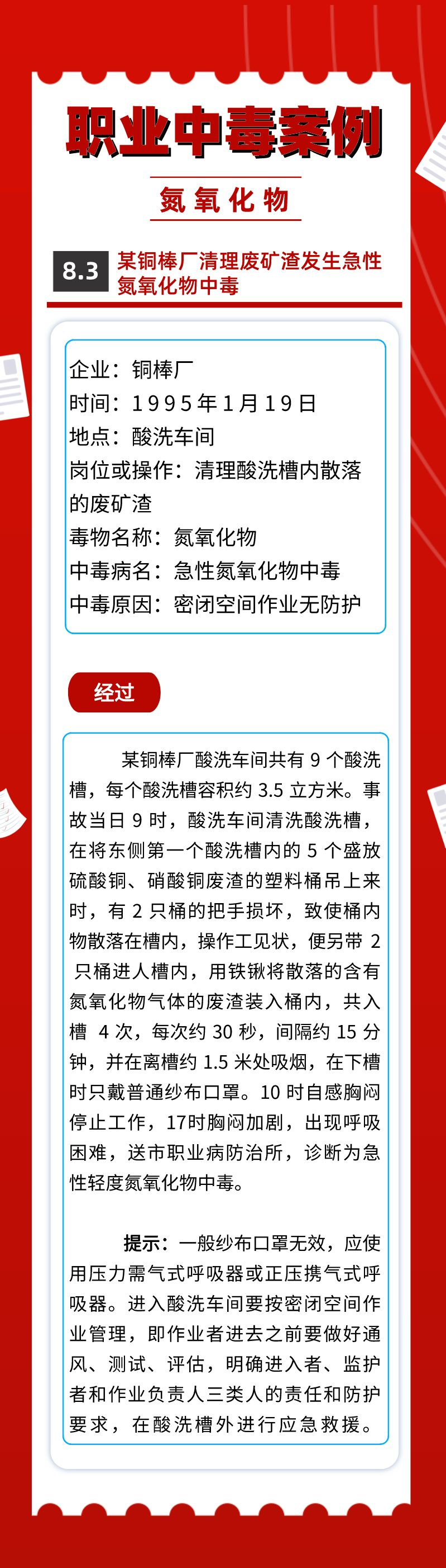 职业中毒特点: 多种职业活动中都可接触到氮氧化物,如制造硝酸或使用硝酸浸洗金属;制造硝基炸药、硝化纤维、苦味酸等硝基化合物、苯胺染料的重氮化过程以及有机物 (如木屑、纸屑)接触浓硝酸时;硝基炸药的爆炸、含氮物质和硝酸燃烧;卫星发射、火箭推进所产生的气体也含有大量的氮氧化物气体。电焊、亚弧焊、气割及电弧发光时,产生的高温能使空气中氧和氮结合成氮氧化物;汽车内燃机排岀的废气中也含有氮氧化物。 另外,某些青饲料和谷物中含有硝酸钾,在通风不良、缺氧条件下发酵,可生成亚硝酸钾和氧,亚硝酸钾进一步变为亚硝酸,当仓内发酵温度增高时,亚硝酸分解成氮氧化物和水,造成“谷仓气体中毒”。各种不同生产过程所形成的硝 烟,其组成不同。