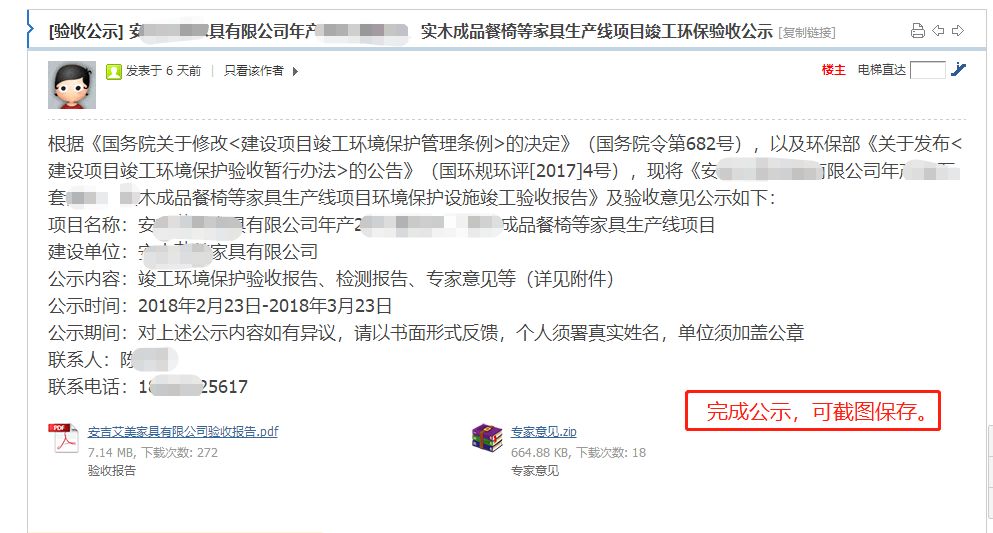 根据《建设项目竣工环境保护验收暂行办法》(国环规环评[2017]4号),“第十一条 (三)验收报告编制完成后 5 个工作日内,公开验收报告,公示的期限 不得少于 20 个工作日 。” “第十三条 验收报告公示期满后 5 个工作日内, 建设单位应当登录全国建设项目竣工环境保护验收信息平台 ,填报建设项目基本信息、环境保护设施验收情况等相关信息,环境保护主管部门对上述信息予以公开。” 提醒: 公示完成后5个工作日内登陆“全国建设项目竣工环境保护验收信息平台”(http://114.251.10.205/#/pub-message)进行信息填报。 其中: “ 验收报告公开形式及载体 ”,请填报“ 网站 及上述公示网址”,如:“网站 http://www.eiafans.com/thread-105**88-1-1.html”