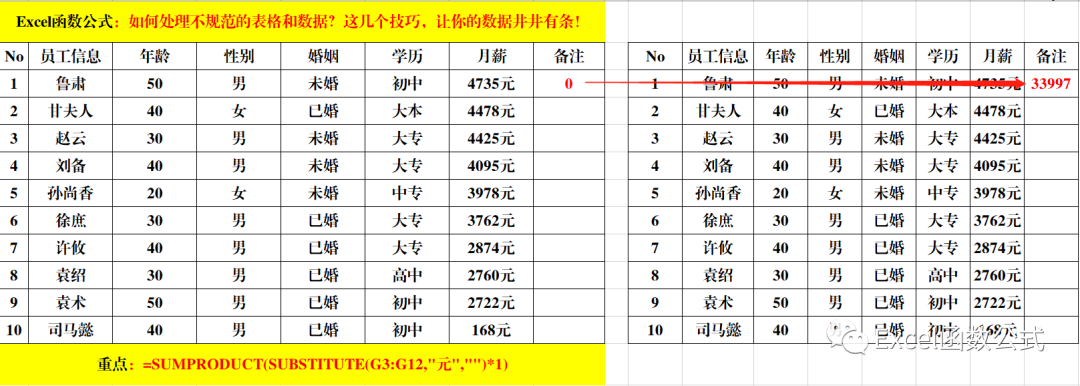 公式的本质就是用Substitute函数将G3:G12单元格区域的“元”替换为空值,并用Sumproduct函数求和。