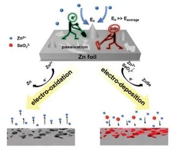 1 ) 开创性的电氧化形成的3D-锌基质显著降低了局部电流密度,有利于适应电镀/剥离过程中的体积变化。同时,电沉积得到的ZnSe覆盖层抑制了副反应,促进了有效的脱溶,从而加速了锌离子在锌阳极上的沉积动力学。