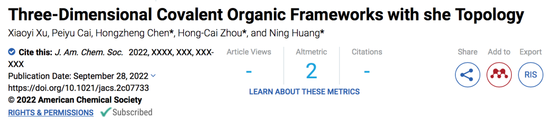 Xiaoyi Xu, et al, Three-Dimensional Covalent Organic Frameworks with she Topology, J. Am. Chem. Soc., 2022