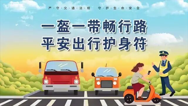 规范使用“一盔一带” 。安全带=生命带,驾乘人员全程都要正确使用安全带。驾驶摩托车、电动自行车出行,注意佩戴安全头盔。