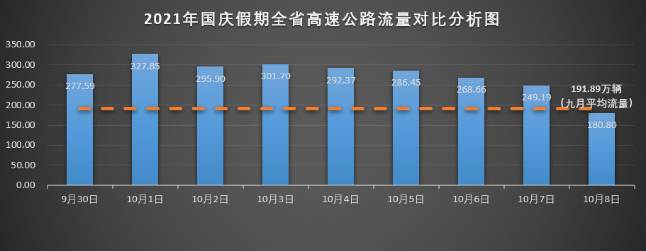 通过分析2021年国庆假期全省高速公路交通流量情况,预计今年国庆假期 全省高速公路日均交通流量较平日上升约35%,假期首日将出现流量高峰 。