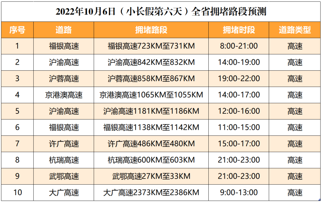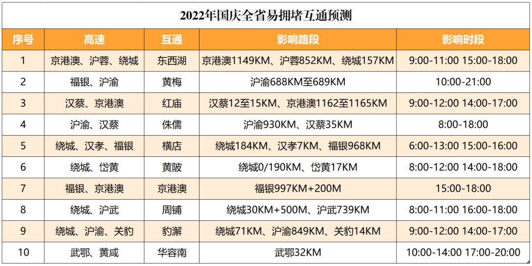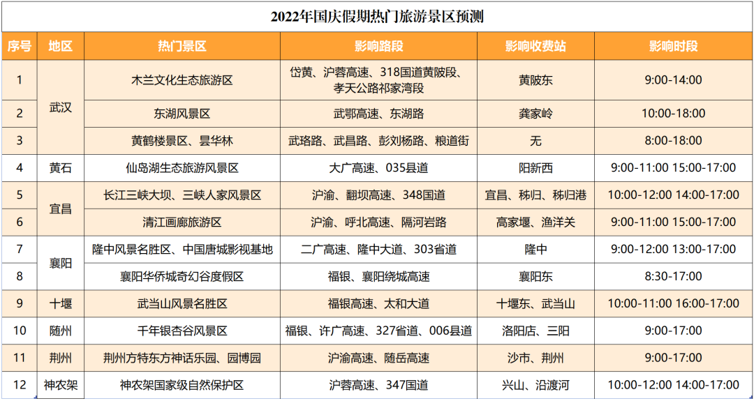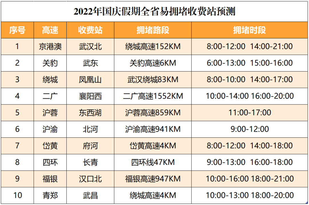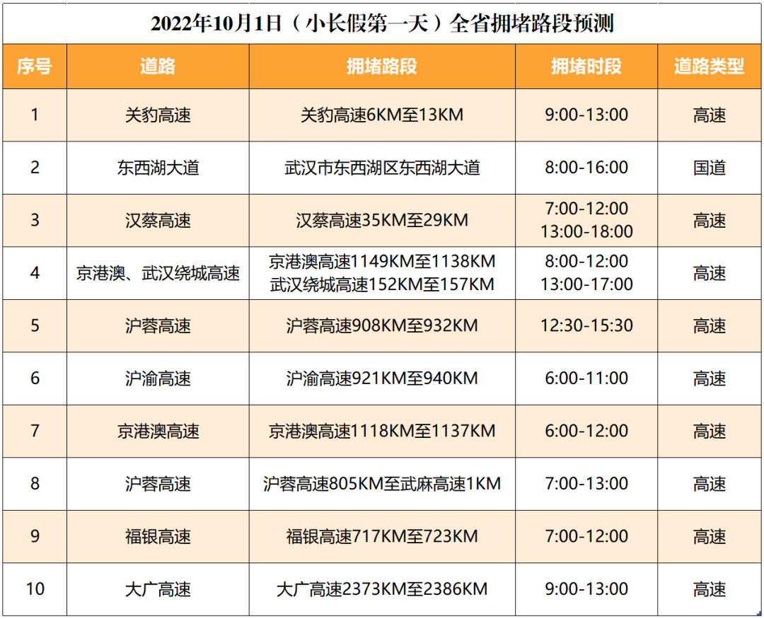 福银、关豹、岱黄、汉孝、汉蔡、武麻高速 等拥堵风险较高。