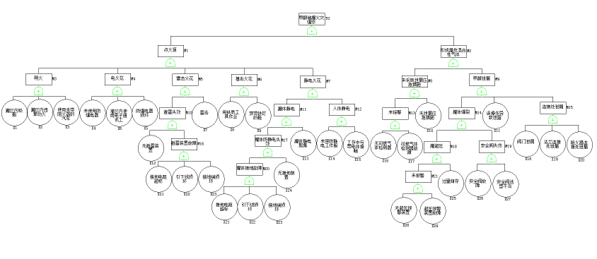 鉴于甲醇储罐区火灾爆炸事故后果严重,选取“甲醇储罐火灾爆炸”作为顶上事件,按照上述作图方法,可以得到事故树分析图如下所示。