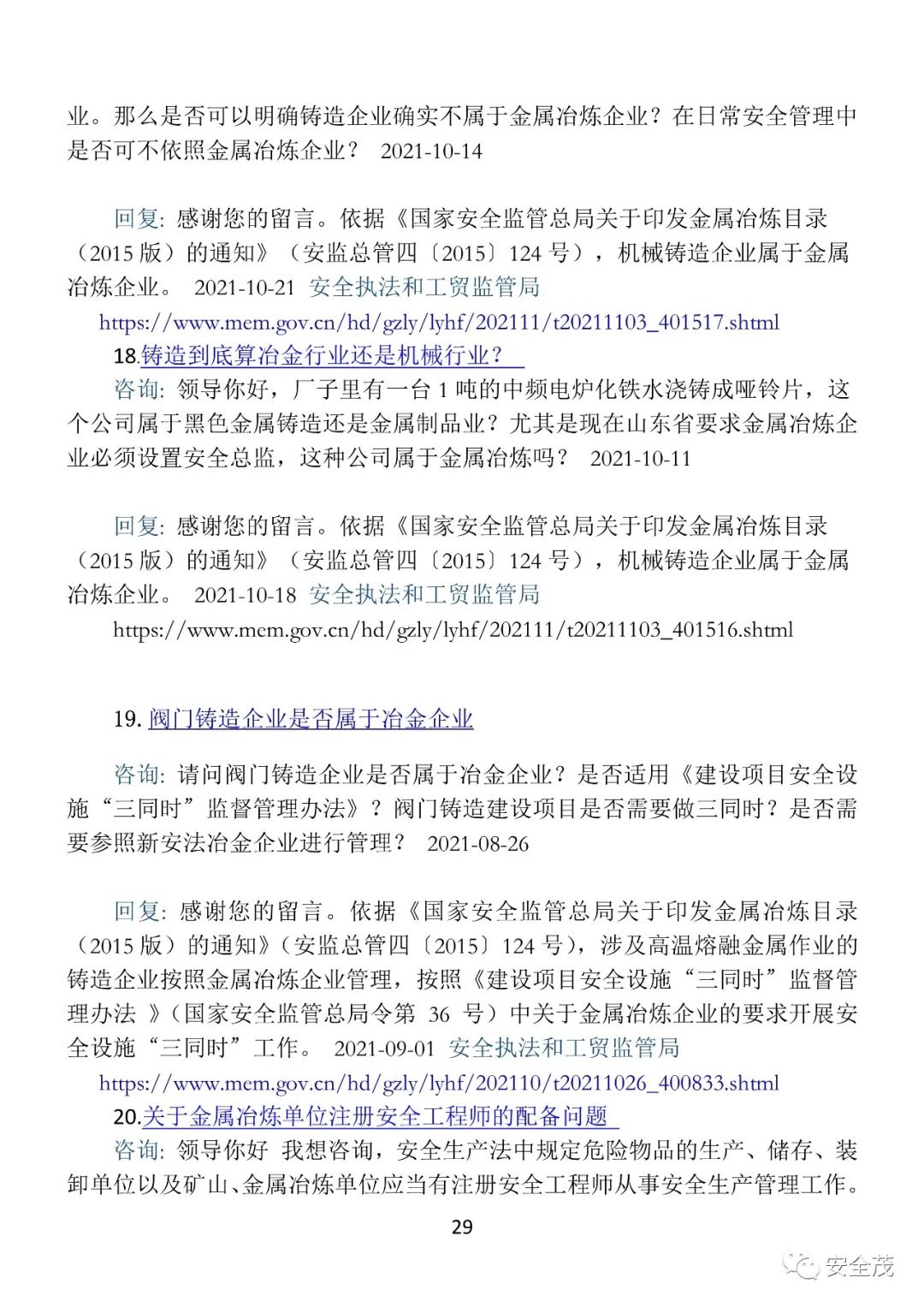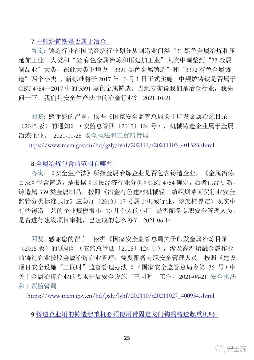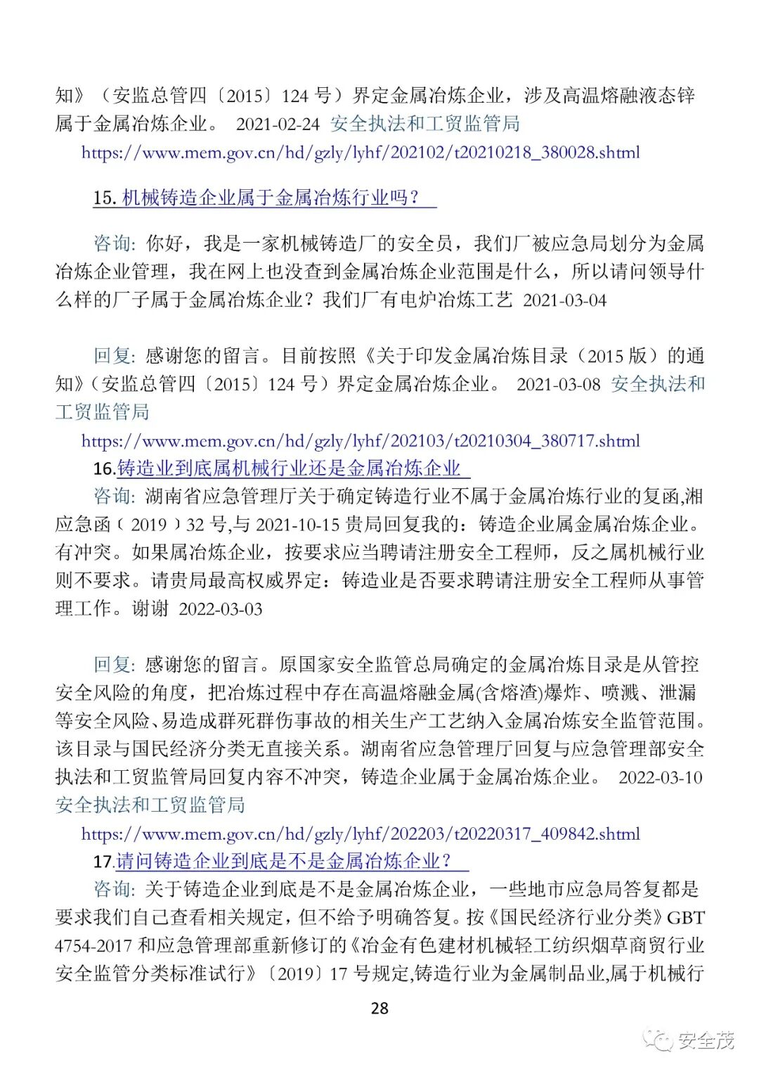 咨询: 湖南省应急管理厅关于确定铸造行业不属于金属冶炼行业的复函,湘应急函﹝2019﹞32号,与2021-10-15贵局回复我的:铸造企业属金属冶炼企业。有冲突。如果属冶炼企业,按要求应当聘请注册安全工程师,反之属机械行业则不要求。请贵局最高权威界定:铸造业是否要求聘请注册安全工程师从事管理工作。谢谢 2022-03-03 回复: 感谢您的留言。原国家安全监管总局确定的金属冶炼目录是从管控安全风险的角度,把冶炼过程中存在高温熔融金属(含熔渣)爆炸、喷溅、泄漏等安全风险、易造成群死群伤事故的相关生产工艺纳入金属冶炼安全监管范围。该目录与国民经济分类无直接关系。湖南省应急管理厅回复与应急管理部安全执法和工贸监管局回复内容不冲突,铸造企业属于金属冶炼企业。2022-03-10 安全执法和工贸监管局
