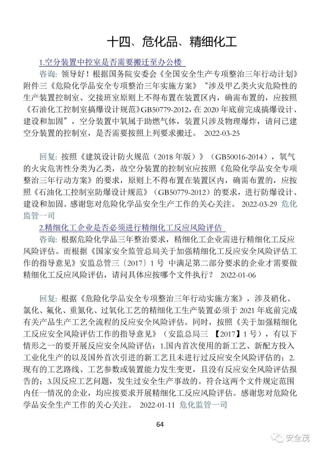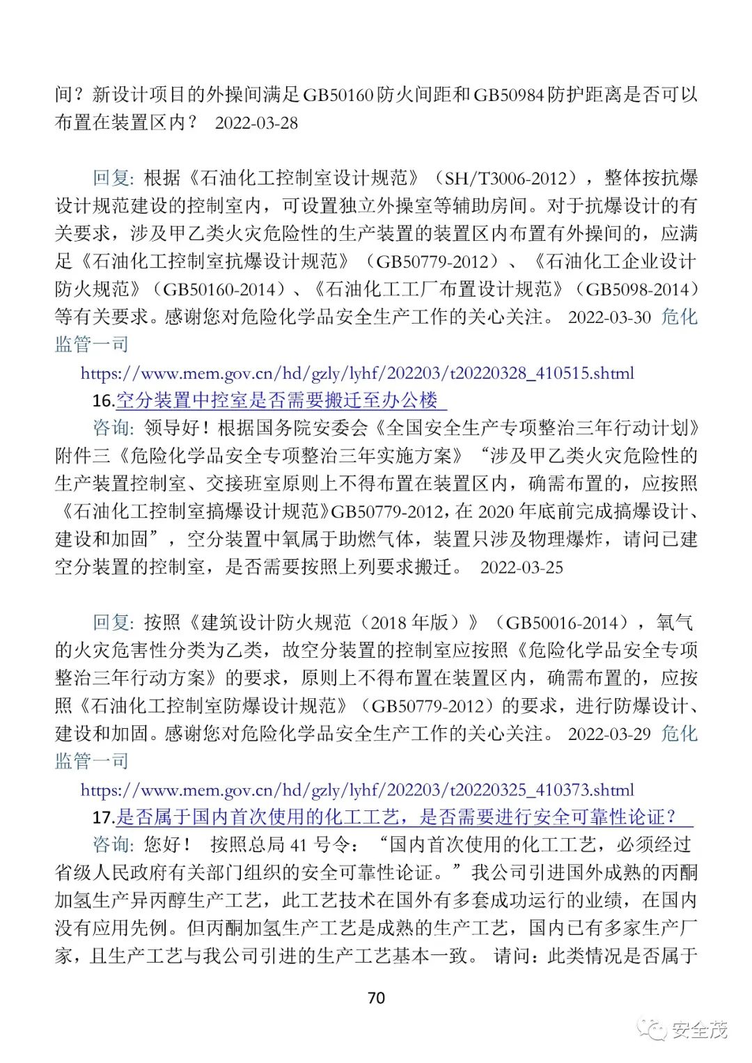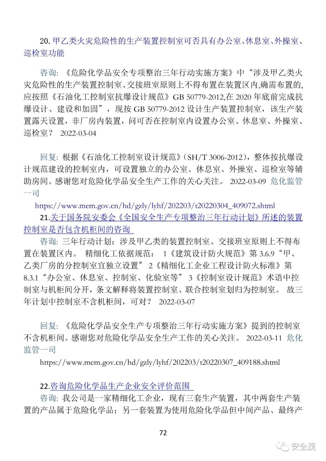 咨询: 《危险化学品安全专项整治三年行动实施方案》中“涉及甲乙类火灾危险性的生产装置控制室、交接班室原则上不得布置在装置区内,确需布置的,应按照《石油化工控制室抗爆设计规范》GB 50779-2012,在2020年底前完成抗爆设计、建设和加固”,现按GB 50779-2012设计生产装置控制室,该生产装置露天设置,非厂房内装置,问可否在控制室内设置办公室、休息室、外操室、巡检室?2022-03-04 回复: 根据《石油化工控制室设计规范》(SH/T 3006-2012),整体按抗爆设计规范建设的控制室内,可设置独立的办公室、休息室、外操室、巡检室等辅助房间。感谢您对危险化学品安全生产工作的关心关注。2022-03-09 危化监管一司