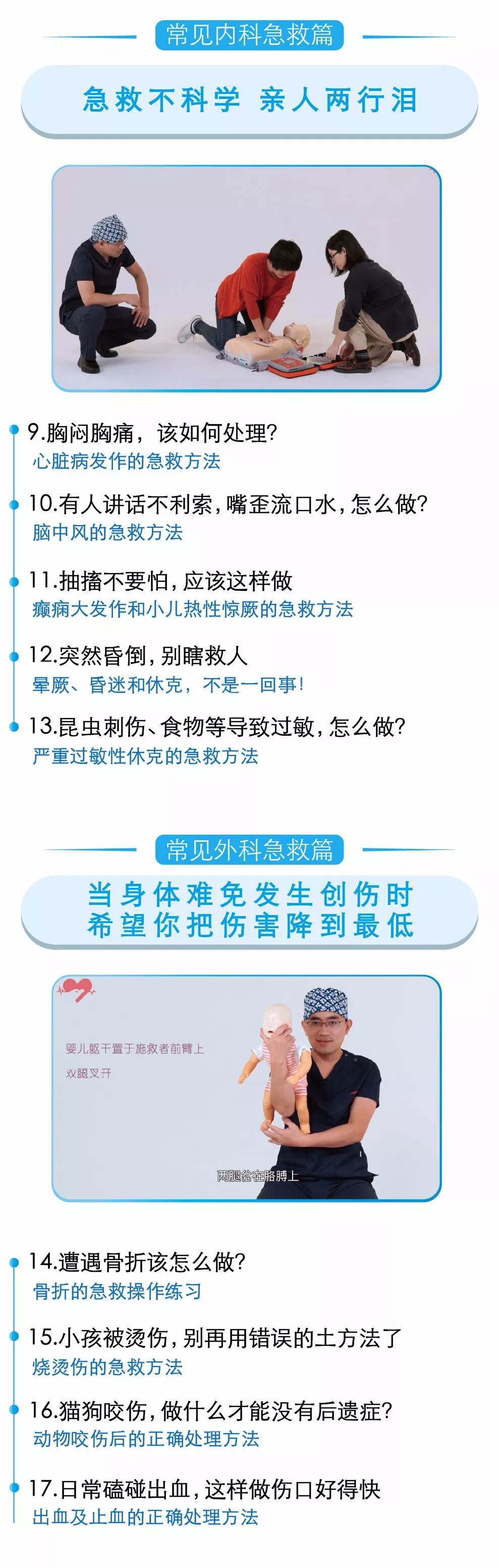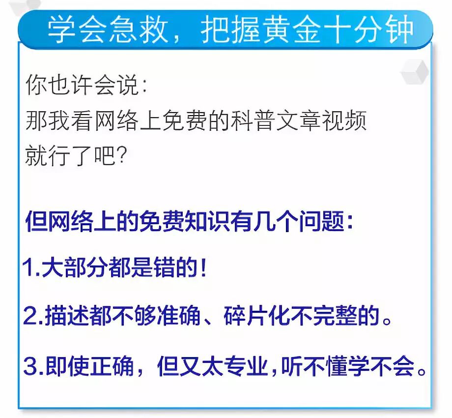 现场急救,单靠医生是完全不够的,情况危急,医生毕竟无法从天而降。如果每个人都能懂一点靠谱、关键的急救术,这些悲剧就能大大减少。 多知道一条急救知识,也许就能多挽救一条生命!