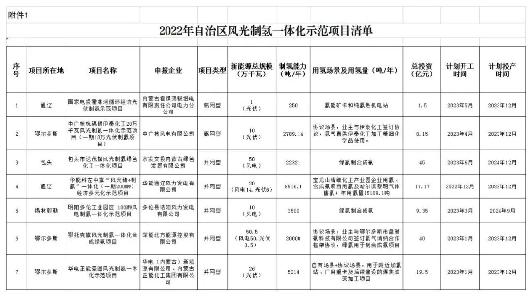 为深入贯彻习近平总书记关于内蒙古系列重要指示精神和《内蒙古自治区人民政府办公厅关于促进氢能产业高质量发展的意见》(内政办发〔2022〕15号)精神,有序推动全区风光制氢一体化示范项目建设,按照《内蒙古自治区风光制氢一体化示范项目实施细则(2022年版)》有关要求,我局组织评估并优选了7个风光制氢一体化示范项目(以下简称“示范项目”),经自治区人民政府审定同意批复实施。现将有关事宜通知如下。