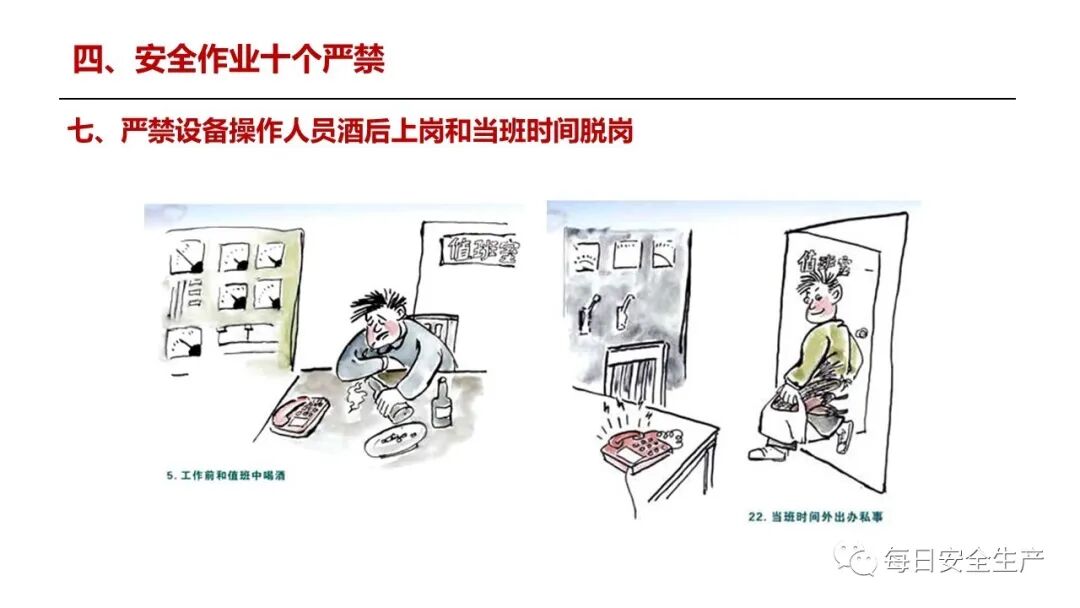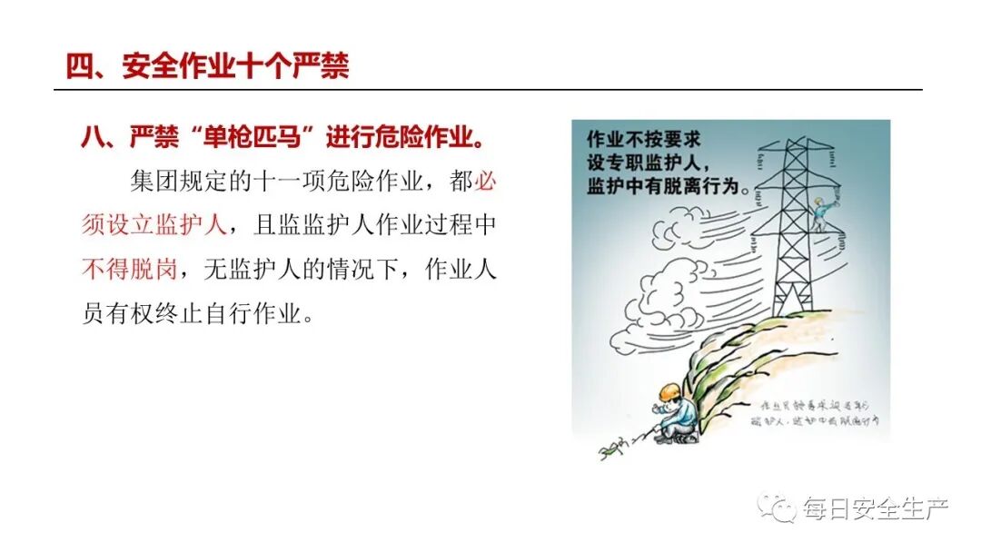 七、严禁设备操作人员酒后上岗和当班时间脱岗; 八、严禁“单枪匹马”进行危险作业 集团规定的十一项危险作业,都必须设立监护人,且监监护人作业过程中不得脱岗,无监护人的情况下,作业人员有权终止自行作业。
