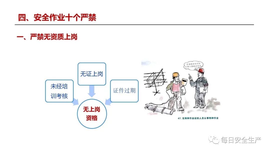一、严禁无资质上岗 A、无证上岗; B、未经培训考核; C、证件过期。