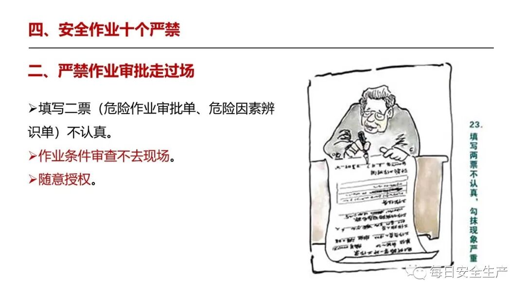 二、严禁作业审批走过场 填写二票(危险作业审批单、危险因素辨识单)不认真; A、作业条件审查不去现场; B、随意授权。