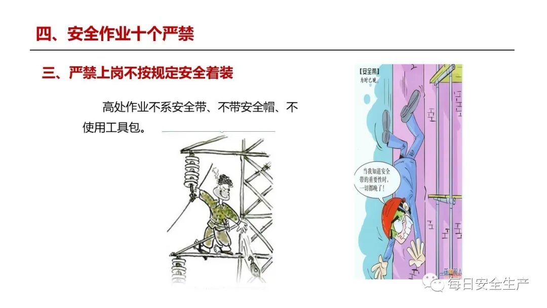 三、严禁上岗不按规定安全着装 A、未穿戴规定的劳保用品; B、穿戴不规范; C、进入防爆区未按要求进行防爆自检; D、高处作业不系安全带、不带安全帽、不使用工具包。