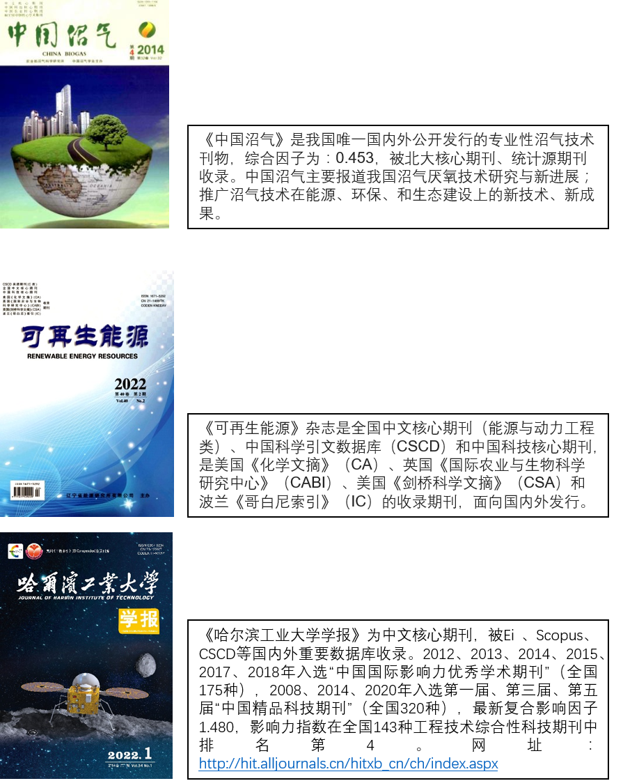 3.集结出版会议论文集,并拟择优推荐《中国沼气》、《可再生能源》、《哈尔滨工业大学学报》收录及出版(对于不愿意公开发表的论文,投稿时请注明)。