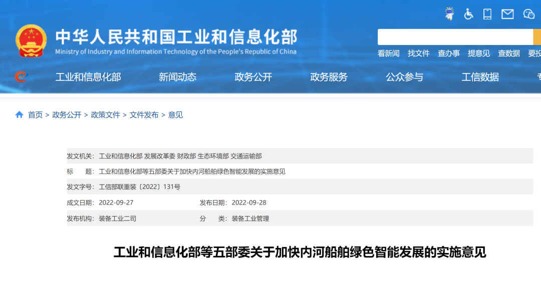 工业和信息化部 发展改革委 财政部 生态环境部 交通运输部联合发布《关于加快内河船舶绿色智能发展的实施意见》