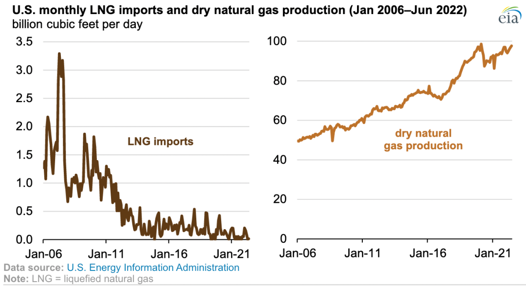 据美国能源信息署的数据,2022年前6个月美国液化天然气(LNG)进口量是15年来最低的,平均每天0.8亿立方英尺,而前5年(2017-2021年)同期的平均进口量为每天2亿立方英尺。美国液化天然气进口通常在冬季月份(10月至3月)达到峰值。