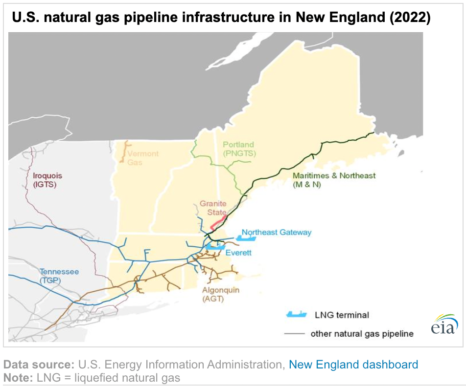 对美国来说,在天然气需求旺盛的冬季,液化天然气进口是一个关键的边际供应来源。在需求高峰期,进口液化天然气可占新英格兰天然气供应的35%。几乎所有美国进口的液化天然气都通过位于马萨诸塞州波士顿的进口码头、位于波士顿港的区域的埃弗雷特液化天然气设施和位于马萨诸塞湾的东北网关运进新英格兰地区市场。