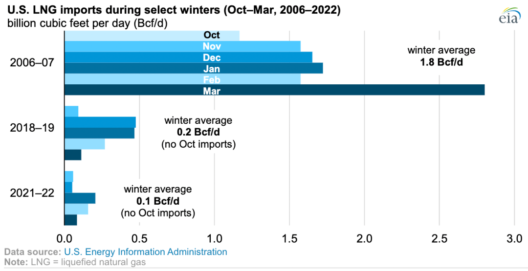 美国液化天然气进口在2007年4月达到最高点,占天然气进口总量的26%(平均33亿立方英尺/天)。2007年至2021年期间,液化天然气进口迅速下降,同时美国本土天然气产量在这一期间增长了近80%。去年冬天,美国液化天然气进口量平均为1亿立方英尺/天,大大低于2006年至2007年冬季,当时液化天然气的进口量达到平均18亿立方英尺/天的峰值。