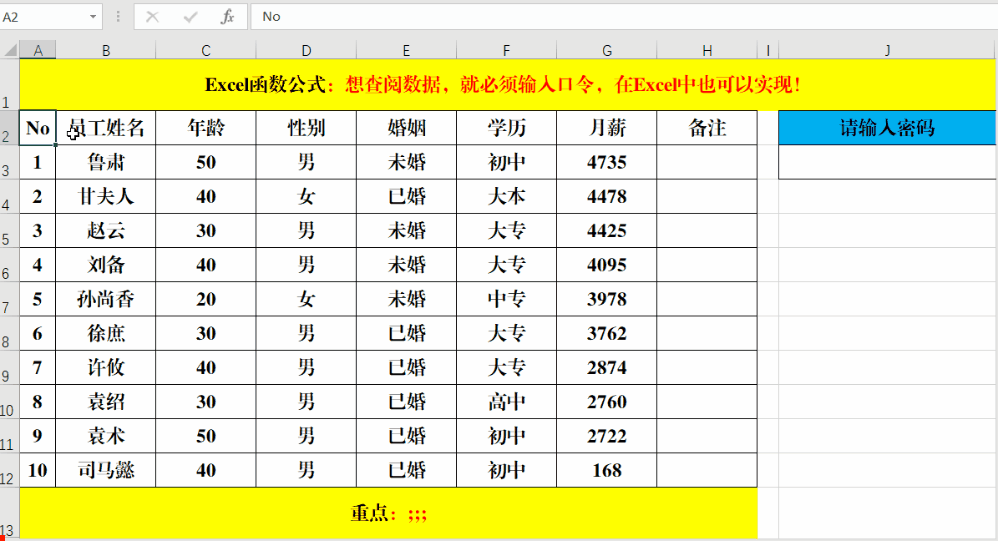 在数据的处理和分析中,有些数据是不允许查阅或者需要输入口令、具有一定权限的人员才能查阅的,除了将数据分发给不同的人员外,还可以在同一张Excel表中实现,效果图如下: