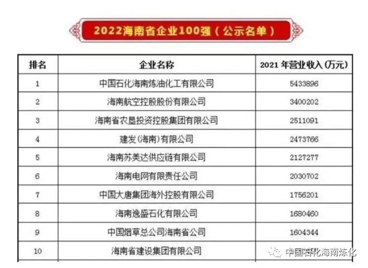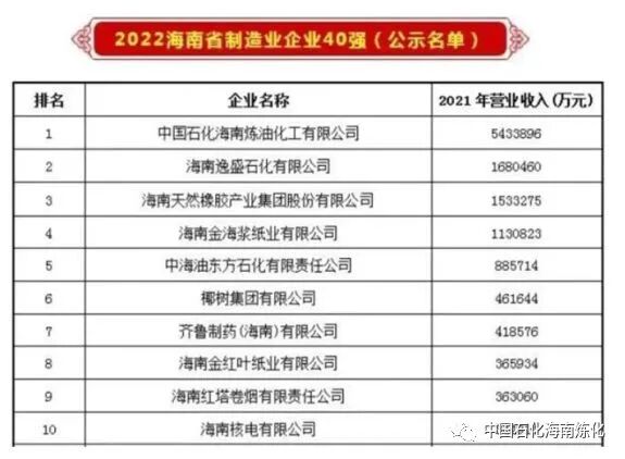 2022年“海南国资”发布海南2022年100强企业的评选结果,海南炼化名列海南省企业100强和海南省制造业企业40强榜首。