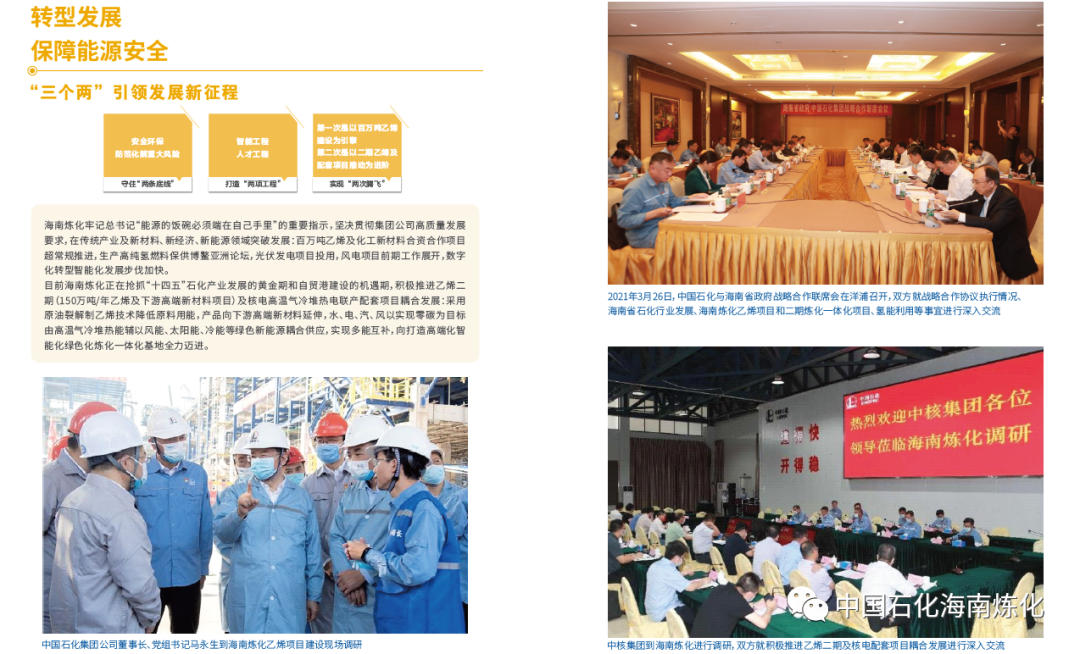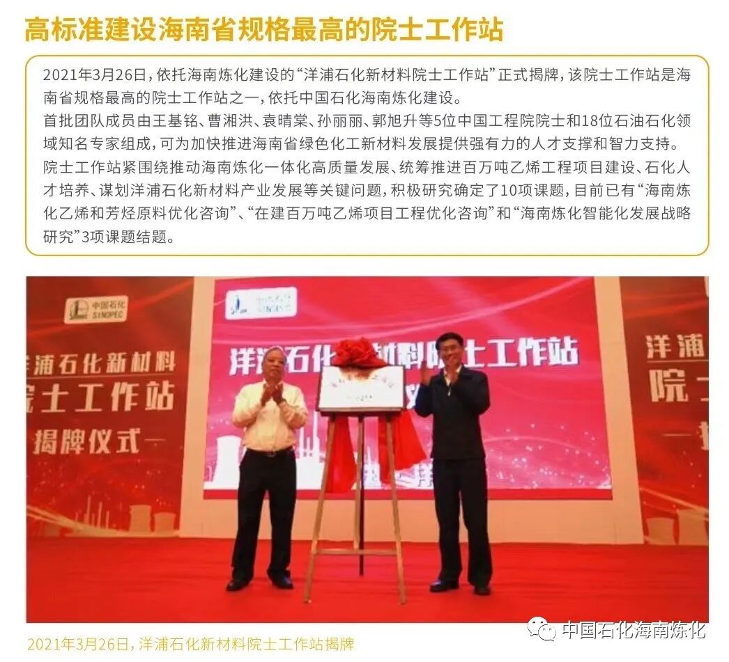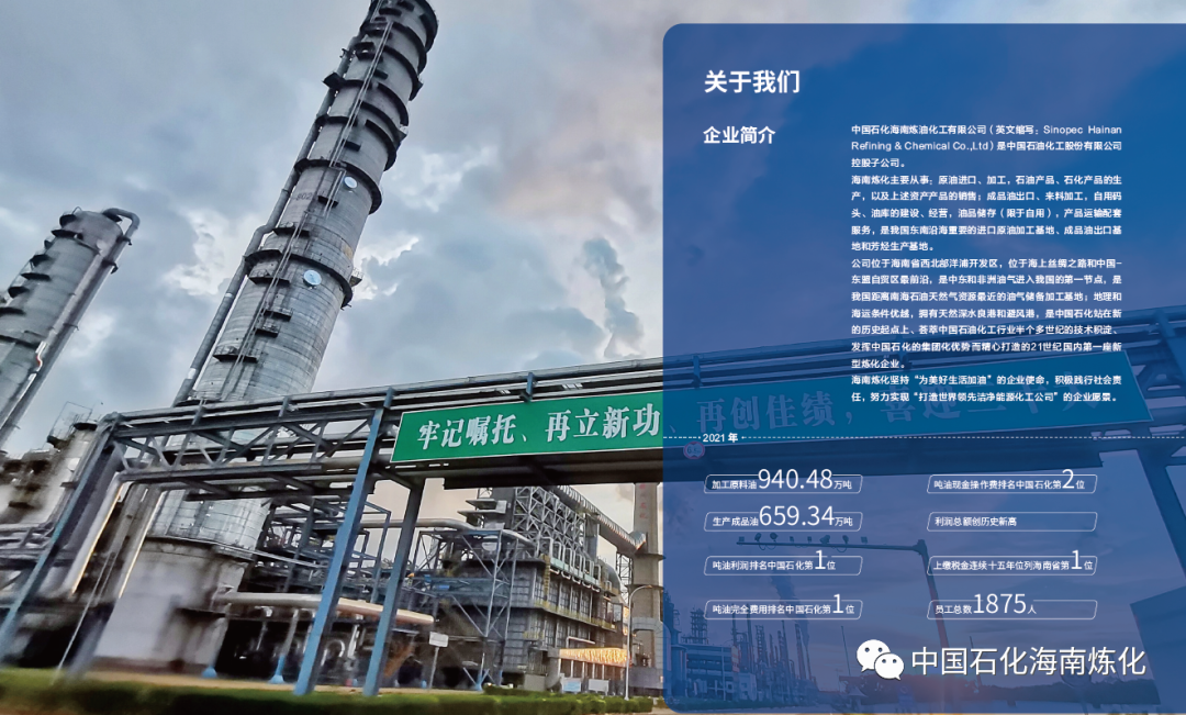 海南炼化公司 位于海南西部的儋州市洋浦经济开发区,是中国21世纪国内 第一座新型炼化企业 ,现原油加工能力920万吨/年、芳烃加工能力160万吨/年,拥有30套炼油化工生产装置及相应的油品储运、公用工程、码头配套设施;主要产品有汽油、柴油、航煤、对二甲苯等。公司100万吨/年乙烯及炼油改扩建项目将于2022年底建成投产。公司充分发挥管理层级压缩、大岗位设置、全流程管控、信息化提效等优势,人员精简、劳动生产率高,实现了“以最少的人管理千万吨级炼化企业”的目标。