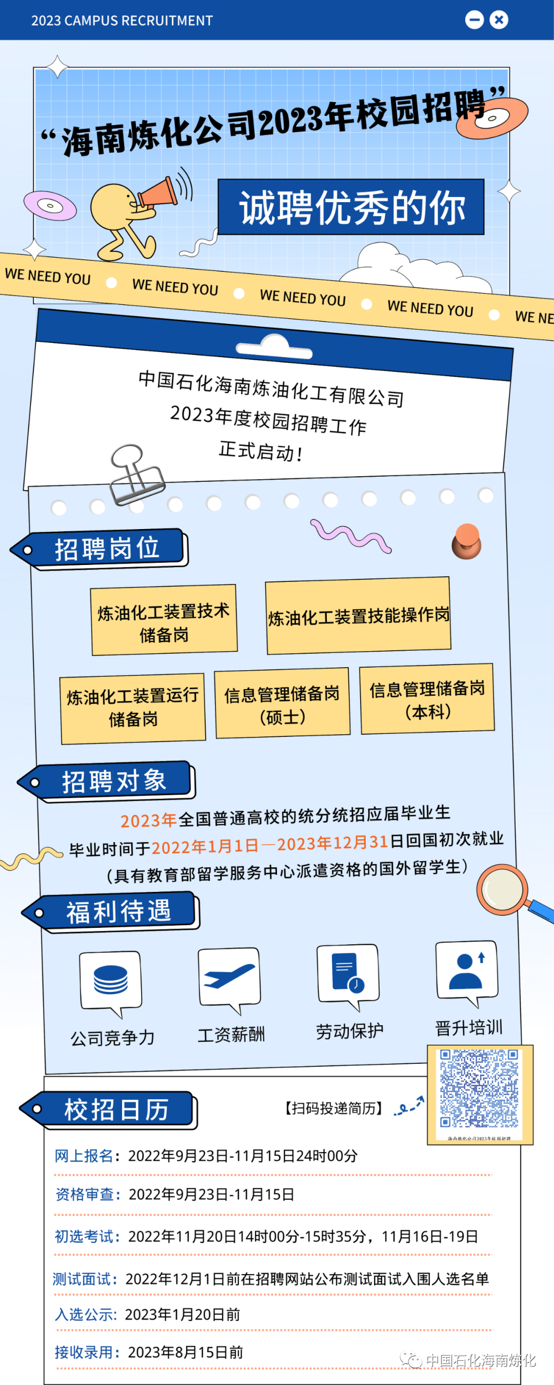 搜索 “海南炼化” , 选中“招聘单位” ,或 扫描下方二维码 ,在“ 海南炼化公司2023年校园招聘 ”中选择适合自己的岗位,点击申请按钮完成报名。