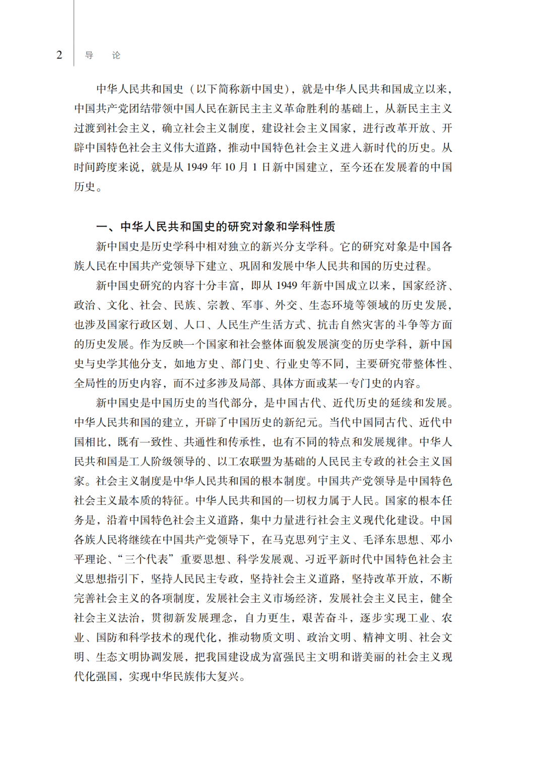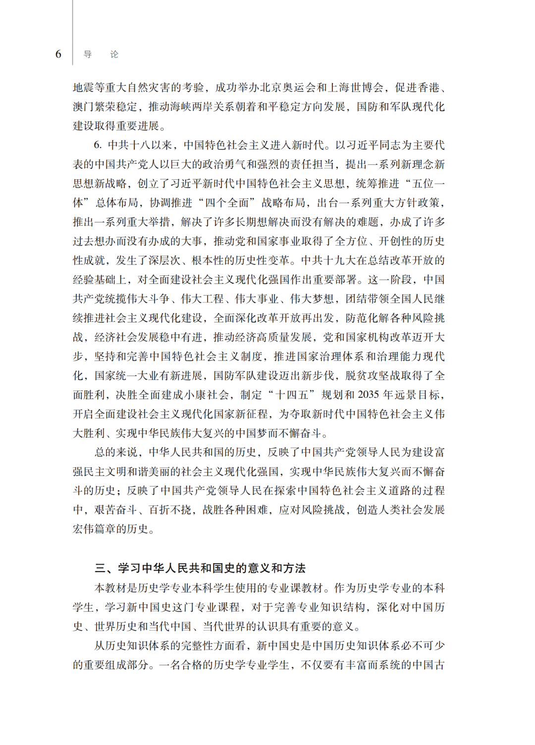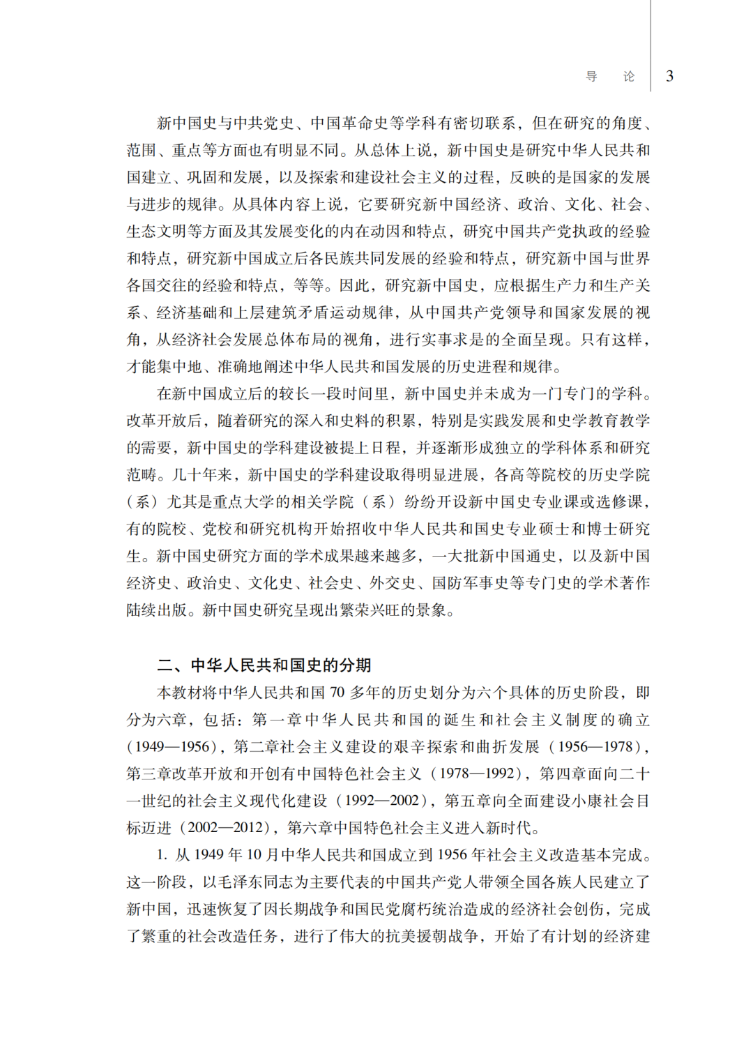 第三,从总体谋篇布局上,教材将中华人民共和国70多年的历史安排为六章:第一章中华人民共和国的诞生和社会主义制度的确立,第二章社会主义建设的艰辛探索和曲折发展,第三章改革开放和开创有中国特色社会主义,第四章面向二十一世纪的社会主义现代化建设,第五章向全面建设小康社会目标迈进,第六章中国特色社会主义进入新时代。这种总体设计展示了中华人民共和国历史的全貌。具体在各章的编写中,力图真实反映在新民主主义革命取得胜利的基础上,中国共产党领导全国各族人民当家作主建立新中国、建立社会主义制度、建设社会主义,进行改革开放和建设中国特色社会主义,中国特色社会主义进入新时代的历史;如实记载开辟中国特色社会主义伟大道路,中华民族从站起来、富起来到强起来的历史过程;有力说明新中国成立、改革开放、新时代是实现中华民族伟大复兴过程中的三座历史丰碑。