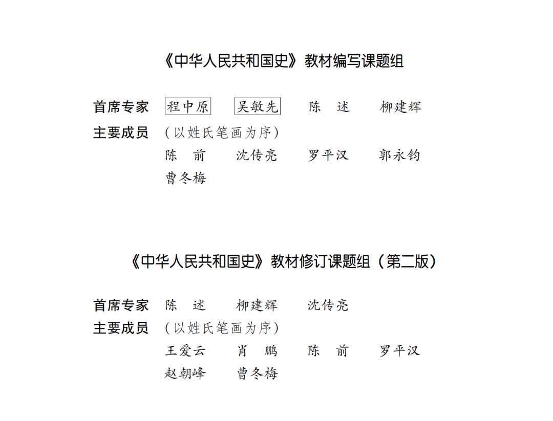 教材修订过程中,马克思主义理论研究和建设工程咨询委员会进行了审议和指导,中央有关部门和国史领域的专家学者也审议了书稿。这次修订由中共中央党校(国家行政学院)陈述教授、柳建辉教授和沈传亮教授任首席专家,主持修订。教材修订课题组主要成员来自中共中央党史和文献研究院、中共中央党校(国家行政学院)、当代中国研究所、北京师范大学、吉林大学、东北师范大学等单位。