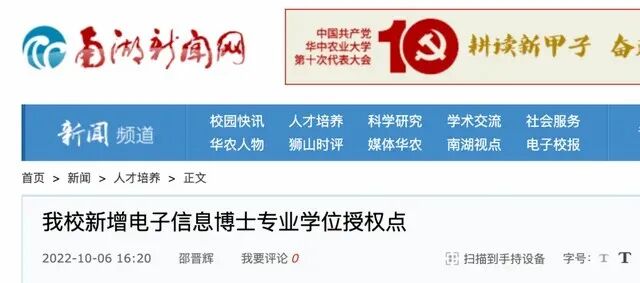 华中农业大学获批新增电子信息博士专业学位授权点。
