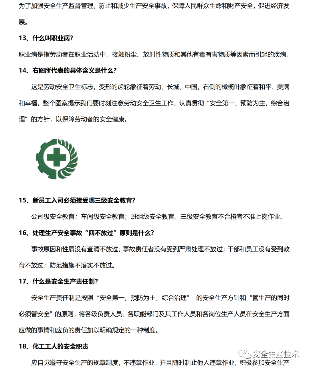 劳动安全卫生标志”以代表劳动安全卫生的绿十字为中心,周围用变性的齿轮和橄榄枝叶构成一个图案,左侧的齿轮象征劳动、长城和中国,右侧的橄榄叶象征着和平、美满和幸福。