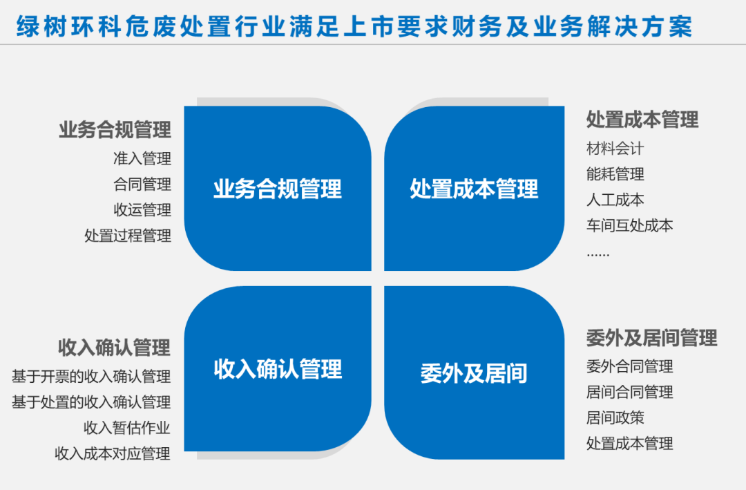 绿树环科基于众多案例沉淀了中国危险废弃物处置行业满足上市要求的财务及业务管理解决方案。
