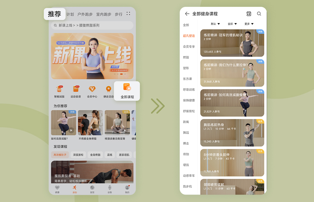 点击底部菜单 「运动」 ,在 推荐 页面的 「全部课程」 中,即可寻找你想练习的课程。