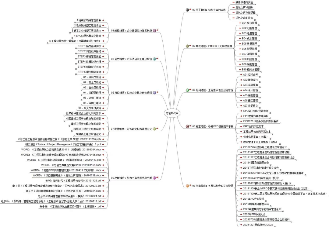 总包知识库有战略、知识、能力、时间、岗位、标准、课题、交流、出版9大维度。