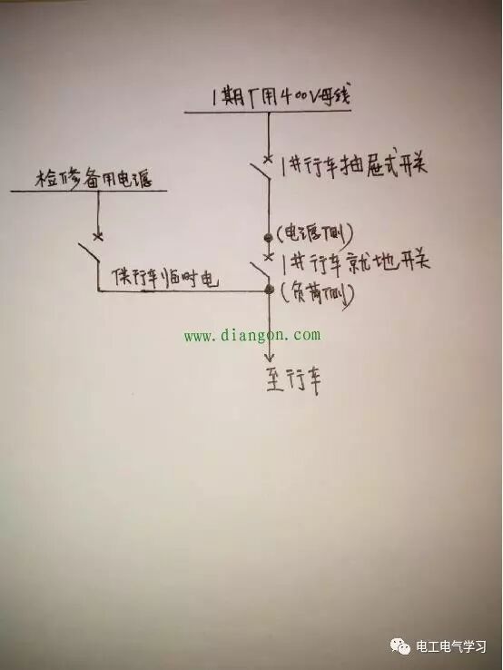 看到这个标题,很多新手电工可能有些不理解了,下面我还是先来讲一个某自备热电厂发生的一次惊险事件吧。事情的经过是这样的(请参照示意图):该厂春节检修期间,计划对1期厂用开关室进行全面的清扫和螺丝紧固,因主厂房1号行车的电源接于1期厂用400V母线,而检修期间需要用此行车,故由前一天早班电气运行人员提前将备用检修电源引一根临时线接于1号行车就地开关的负荷侧(为了接线方便,直接做的铜鼻子并接在就地行车开关的负荷侧),并将就地行车开关拉电挂牌,第二天早班,当班电气运行正值先将1期厂用变由运行改为冷备用状态,而1期厂用开关室的1号行车抽屉式开关仍处于合位状态。这时,机务检修人员甲某要求电气人员将1号行车送电,值长安排副值前去将临时检修电源的行车临时开关合上,机务人员乙某在主厂房正好遇到电气运行正值,告知说即将需要使用行车,麻烦将行车送电,电气正值班此时正在忙于各种工作票的许可工作,因距离行车开关不远,听后,立刻跑过去不假思索的将行车的就地开关合上。此时检修电源倒送至1期厂用400母线,后该正值到1期厂用开关室准备验电挂接地,发现400V仍带电,并及时发现自己的操作失误,及时的化解了一场险情,事后让大家都倒吸了一口凉气。