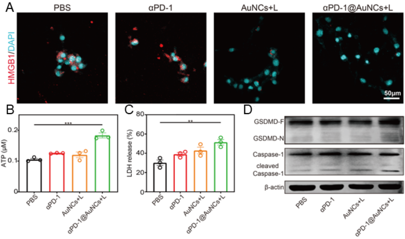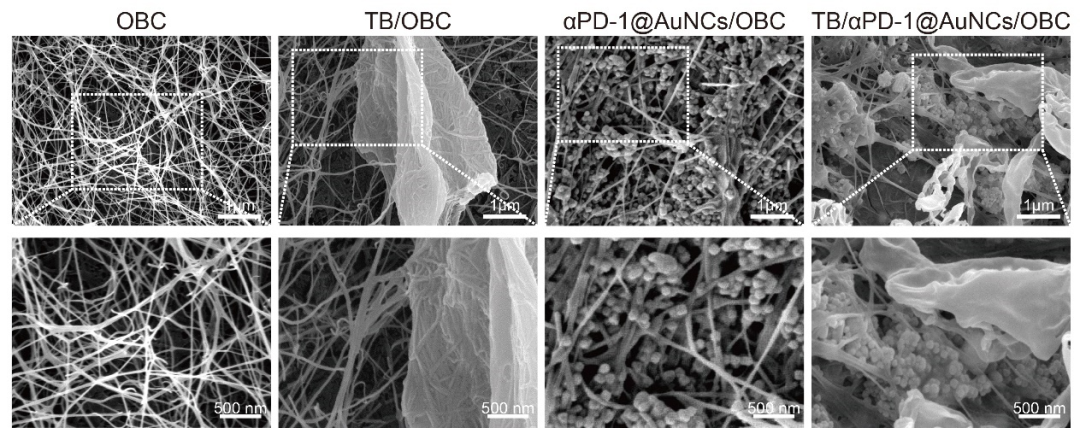 头颈部鳞状细胞癌是临床上最常见的癌症之一。由于其进展迅速,60%以上的病例发现时已是中晚期,而在晚期患者中,又有50%-60%的患者会出现术后复发和转移,导致5年生存率较低。手术切除被认为是临床治疗头颈鳞癌的主要手段。约40%-60%的晚期HNSCC患者在手术后会出现局部复发,常规化疗和放疗经常用于预防术后肿瘤复发。然而,这些都受到全身毒性、耐药性和免疫系统损伤的限制。近日, 华中科技大学生命科学与技术学院杨光教授团队与武汉大学口腔医学院孙志军教授团队...(TB/αPD-1@AuNCs/OBC)。 该研究在氧化细菌纤维素膜网络结构中负载凝血酶与金纳米笼荷载PD-1抗体应用于头颈鳞癌术后治疗,更高效的诱导肿瘤细胞焦亡,提高免疫检查点阻断治疗的响应率,抑制肿瘤术后的复发。