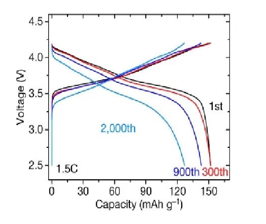 在2500个循环后,保持90%的容量。在5700个循环后保持80%的容量。在9300个循环后,保持70%的容量。