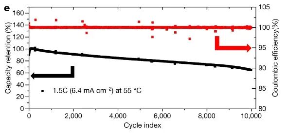 图3展示了电池的长循环能力。 在2500个循环后,保持90%的容量。在5700个循环后保持80%的容量。在9300个循环后,保持70%的容量。