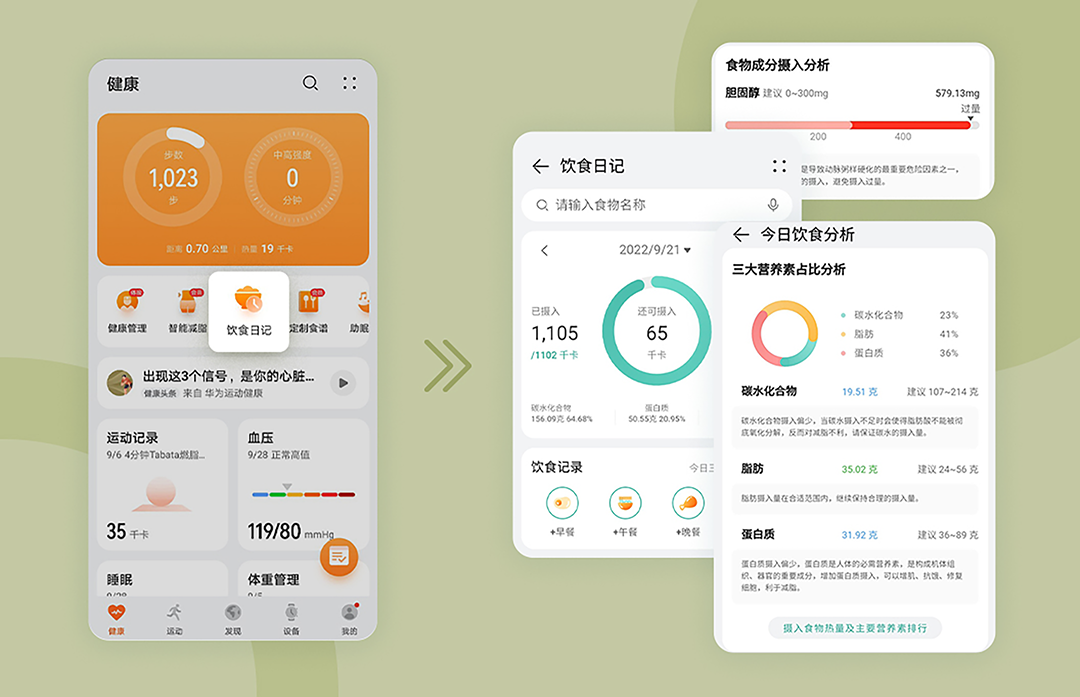 华为运动健康APP 的 饮食分析 功能来帮你。只须在 饮食日记 中记录每一餐吃了哪些食物,点击 饮食分析 ,即可获取 三餐热量、三大营养素占比、食物成分摄入等多维度的分析报告 。同时,分析还会给出对应的建议,帮助你将饮食调整得更健康。