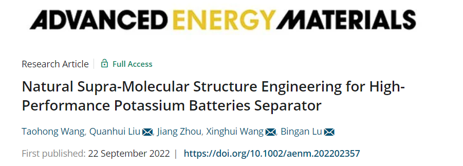 Taohong Wang, et al, Natural Supra-Molecular Structure Engineering for High-Performance Potassium Batteries Separator, Adv. Energy Mater. 2022