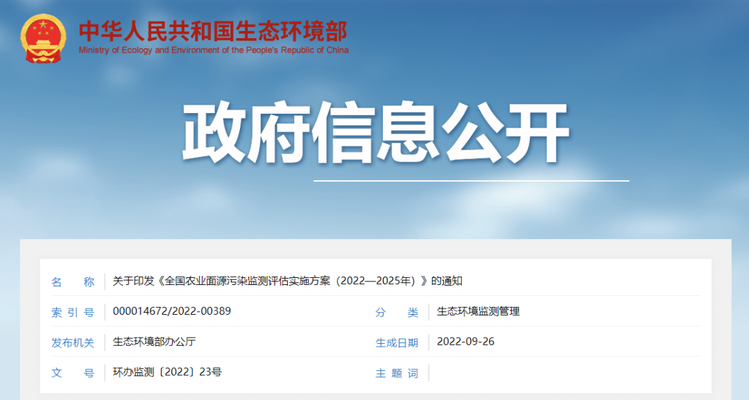 生态环境部最新发布 |《全国农业面源污染监测评估实施方案(2022-2025年)》