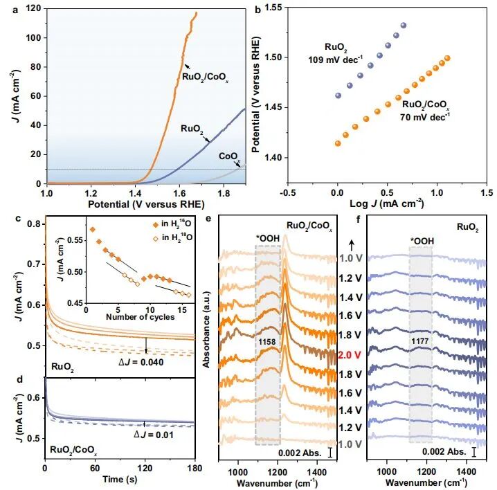 研究人员结合理论计算、原位X射线光电子能谱(XPS)和原位紫外-可见(UV-Vis)吸收光谱,证明了由于牺牲了CoO x 的氧化和界面电子效应,降低RuO 2 溶解的驱动力和富集RuO 2 上的电子来稳定RuO 2 ,因此RuO 2 /CoO x 催化剂的稳定性显著超过了块状RuO 2 。此外,动力学同位素效应(KIE)、原位红外反射(IR)和理论计算证实了界面的构建导致RuO 2 /CoO x 界面周围产生了高活性的Ru/Co双原子位点,相应的协同作用在OER过程中吸附关键的氧中间体,优化了反应热力学和动力学。