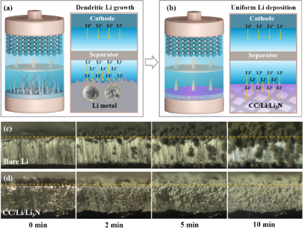图5 . Li + 在CC/Li/Li 3 N电极上的传输机理示意图及原位光学显微镜观察锂沉积